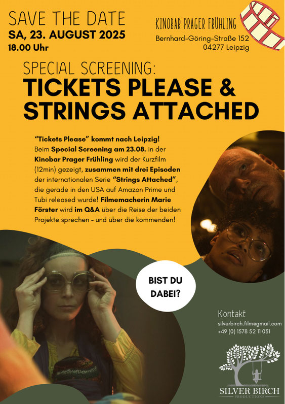 Ein voller Erfolg war das Special Screening von Marie Filmproduktionsfirma Silverbirch am Sa, 23.08.2025 in der Kinobar Prager Frühling in Leipzig. Maries erster Kurzfilm "Tickets Please" als Teil des Screenings, bei dem auch drei Folgen der Serie „Strings Attached“ gezeigt wurden.